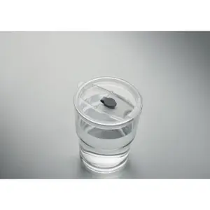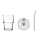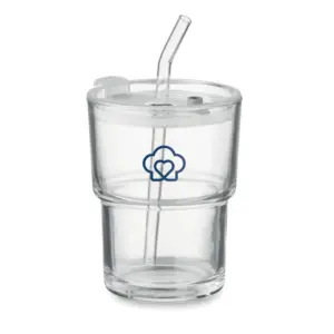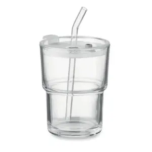 Glazen beker van 300 ml met drinkdeksel en rietje. Voor koffie, thee of koude drankjes.