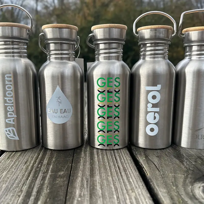 Vanaf 12 stuks al te graveren met logo en vanaf 48 stuks te bedrukken met eigen logo of print. All-in prijs bij 96 stuks € 13,75 inclusief bedrukking, instelkosten en transport. All-in prijs bij 500 stuks € 9,50. Mail ons voor de volledige prijslijst en/of gratis digitale proefdruk met jullie print. Of kom eens langs bij ons in Apeldoorn!