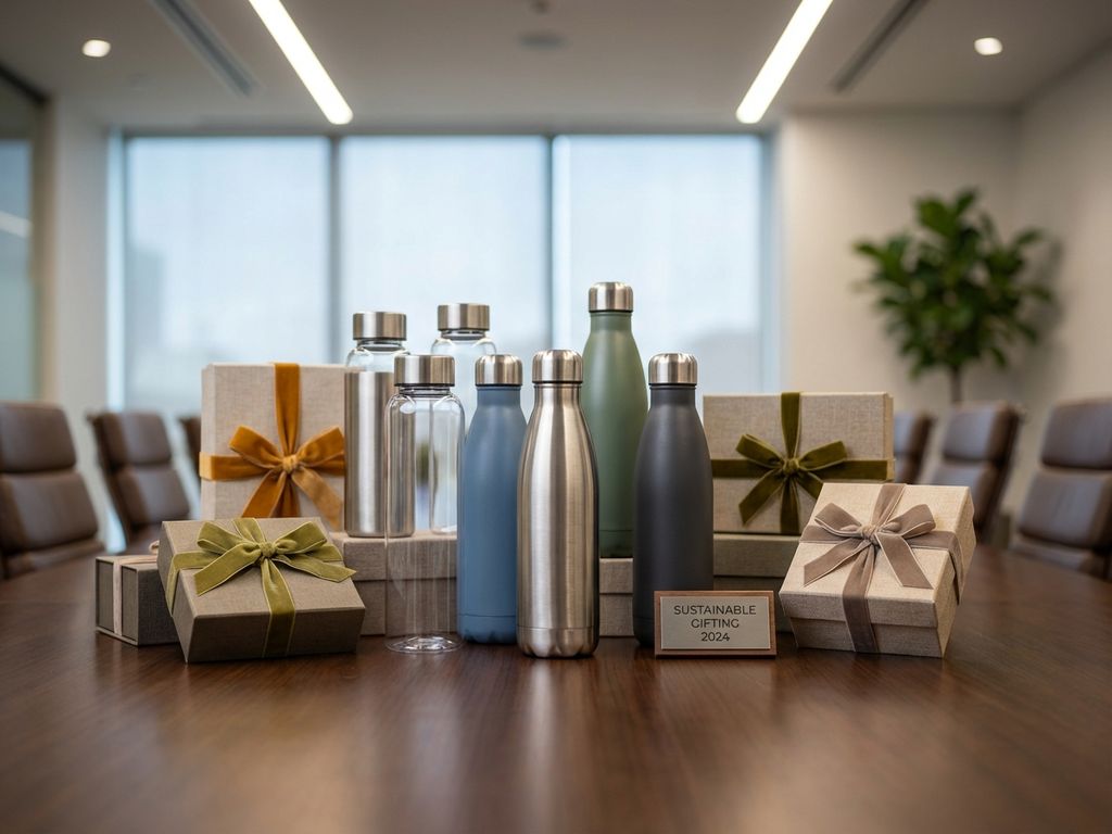 Duurzame relatiegeschenken met premium waterflessen op houten vergadertafel met elegante cadeauverpakking