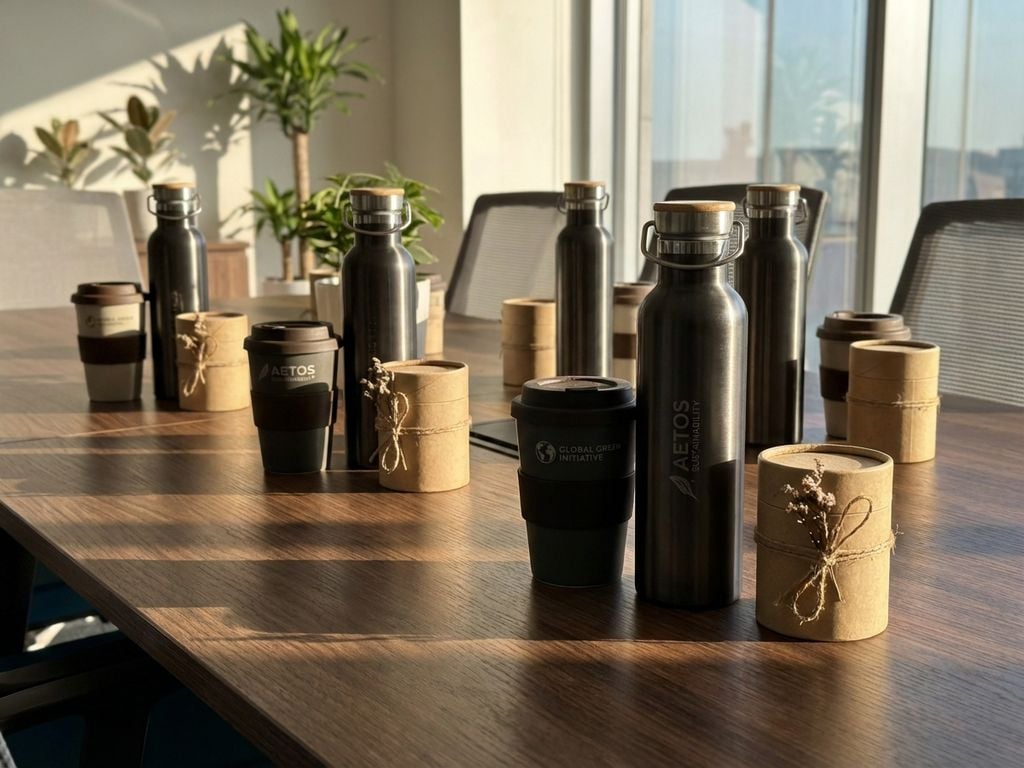 Luxe herbruikbare waterflessen en koffiemokken met gravure op houten vergadertafel met eco-vriendelijke geschenkdozen