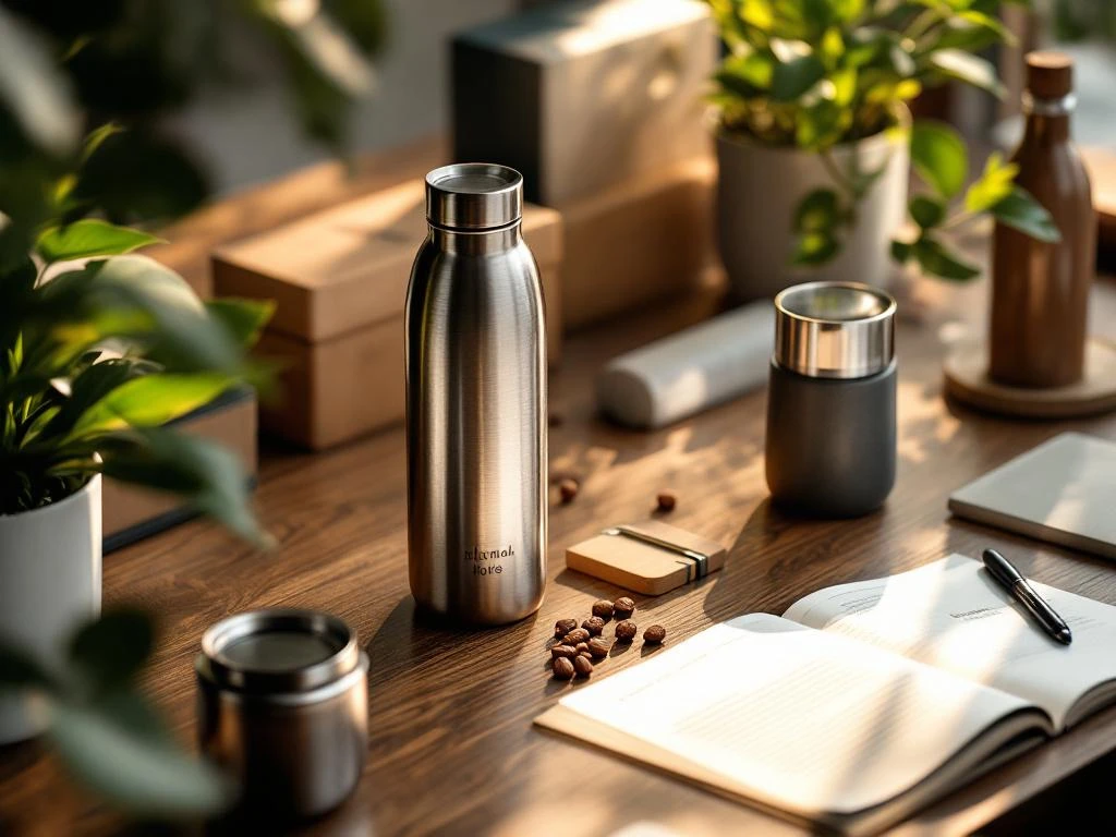 Houten bureau met duurzame relatiegeschenken: roestvrijstalen waterflessen, thermische koffiemokken en eco-verpakking