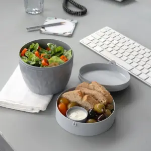 Het bovenste deel van deze lunchpod biedt voldoende opbergruimte voor toppings zoals bessen of croutons, het kleine blikje is voor dressing, siroop of honing. Bedrukt ca. € 14.