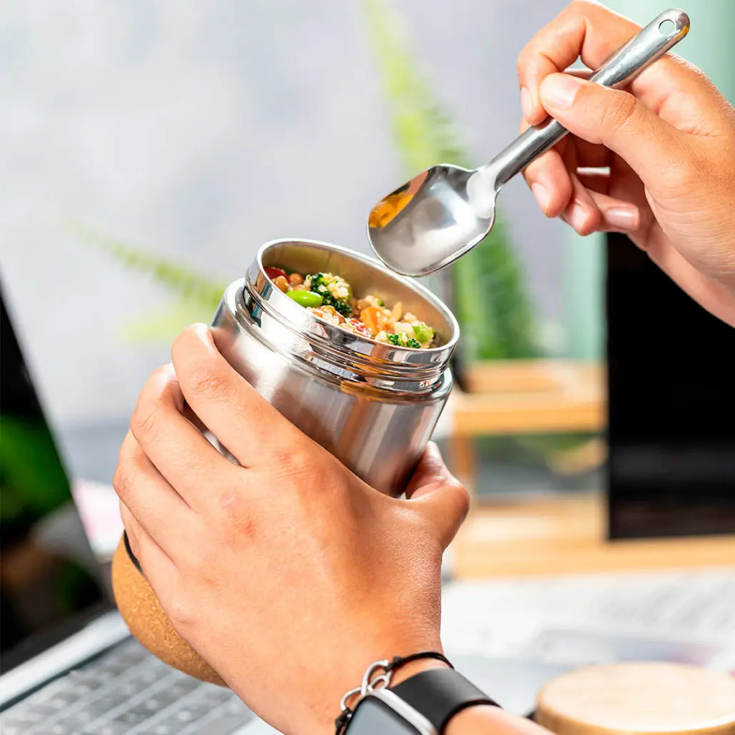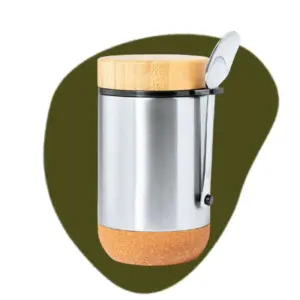 Prachtige foodpod van 450 ml. met kurkbodem en bamboe deksel, inclusief lepel. Handig om je lunch of maaltijd op temperatuur mee te nemen. In mooie eco kadodoos, bedrukt ca.€ 11.