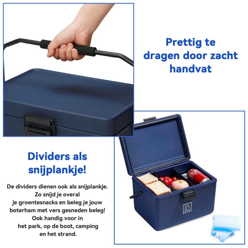 Capaciteit van 12 liter, 2 gratis dikke koelementen van 450ml per stuk, dividers, snijplanken, een comfortabele schouderband met een geïntegreerde bieropener / flesopener houdt deze Frigobox jouw eten en drinken tot wel 40 uur koel: