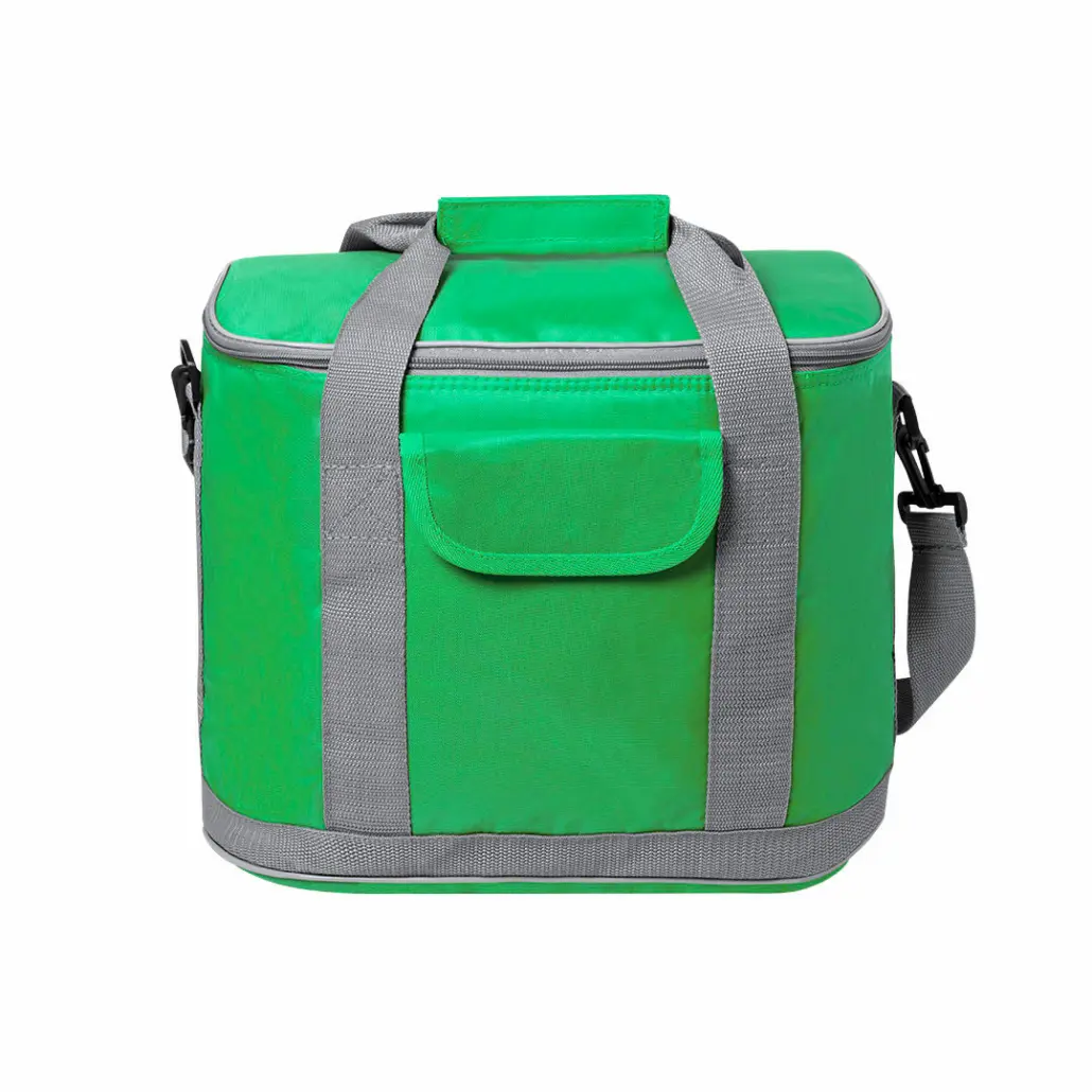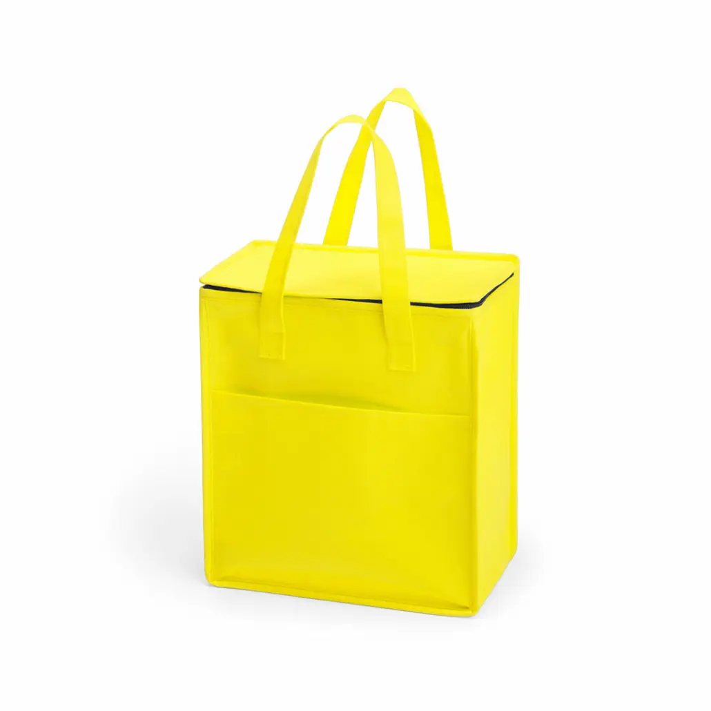 Eenvoudige koeltas in felgekleurd non-woven materiaal, met ritssluiting en voorvak. Bedrukt ca. € 5.