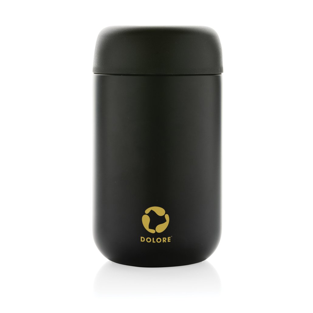 Small 160ml, Dubbelwandige beker. Roestvrijstalen behuizing met zwarte kunststof deksel.
