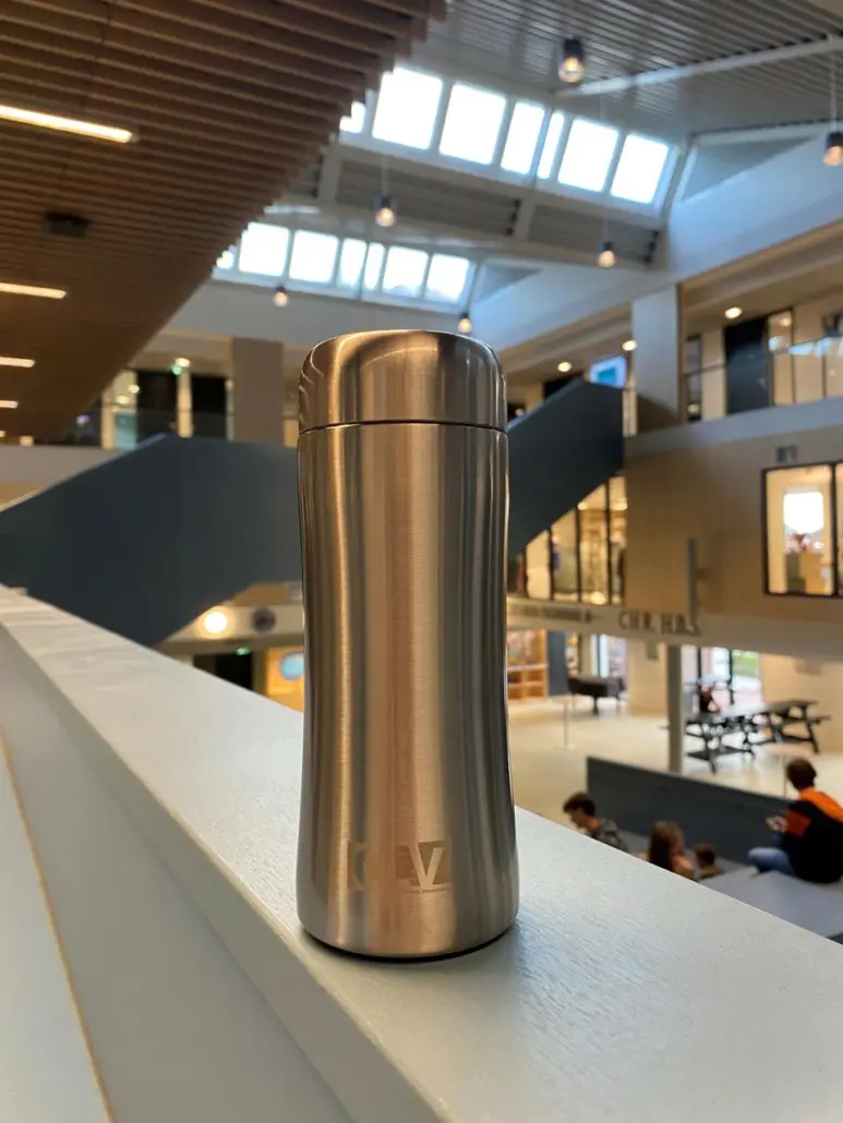 De tumbler is in verschillende kleuren te verkrijgen. Het CLV heeft gekozen om voor de RVS tumbler met een gravure.
