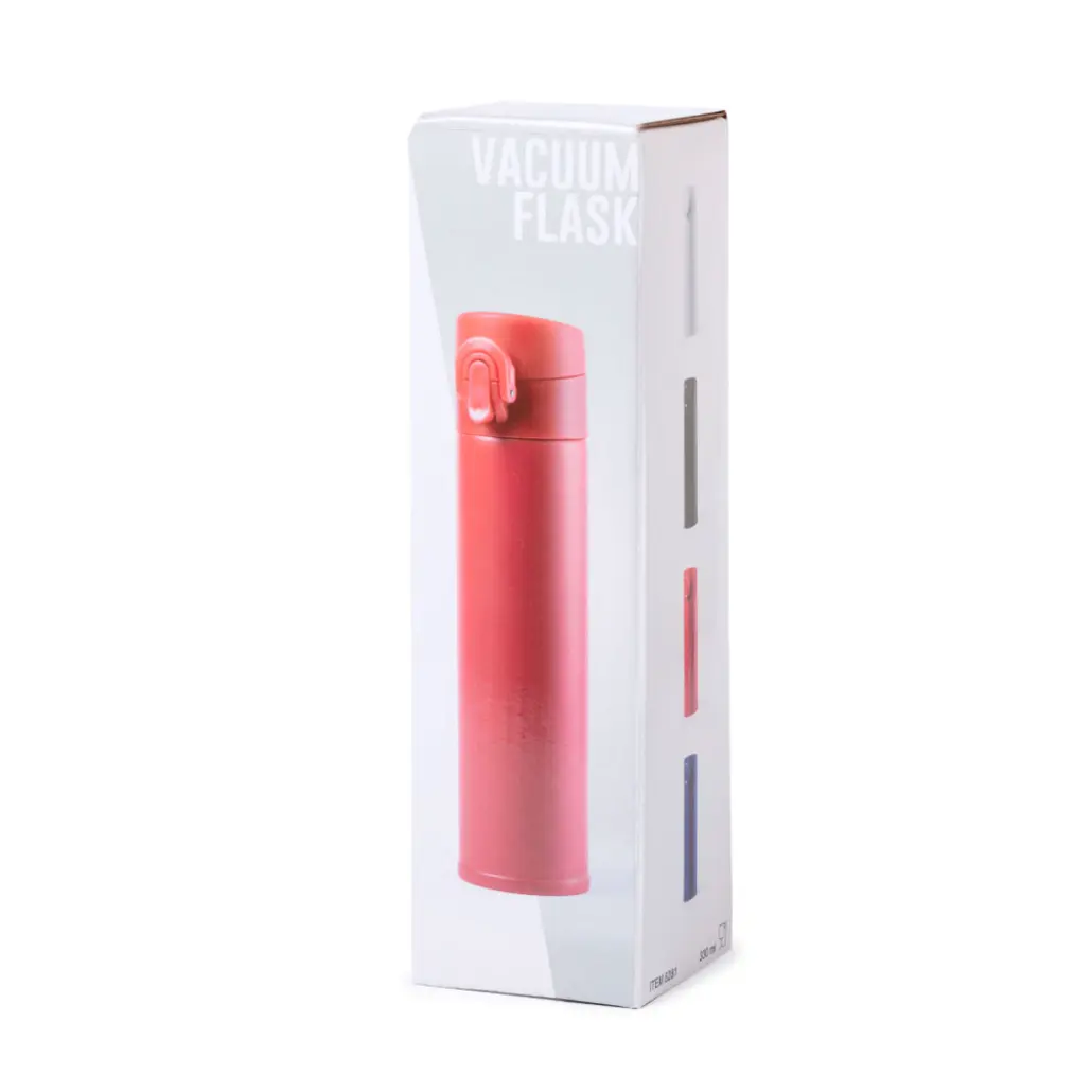 330 ml thermo in roestvrij staal. Dubbelwandig met een eenvoudig knop-openingsmechanisme. Beschikbaar in een breed scala aan kleuren en gepresenteerd in een aantrekkelijke designdoos.