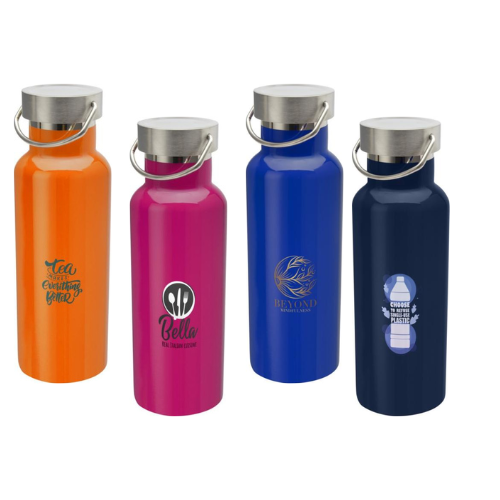 Drinkfles 630 ml. Roestvrijstalen behuizing in matte afwerking, keuze uit 7 kleuren. Drinkfles met schroefdop en gepresenteerd in een aantrekkelijke geschenkverpakking. Verkrijgbaar in blauw, zwart, wit, zilver, groen, rood of goud.