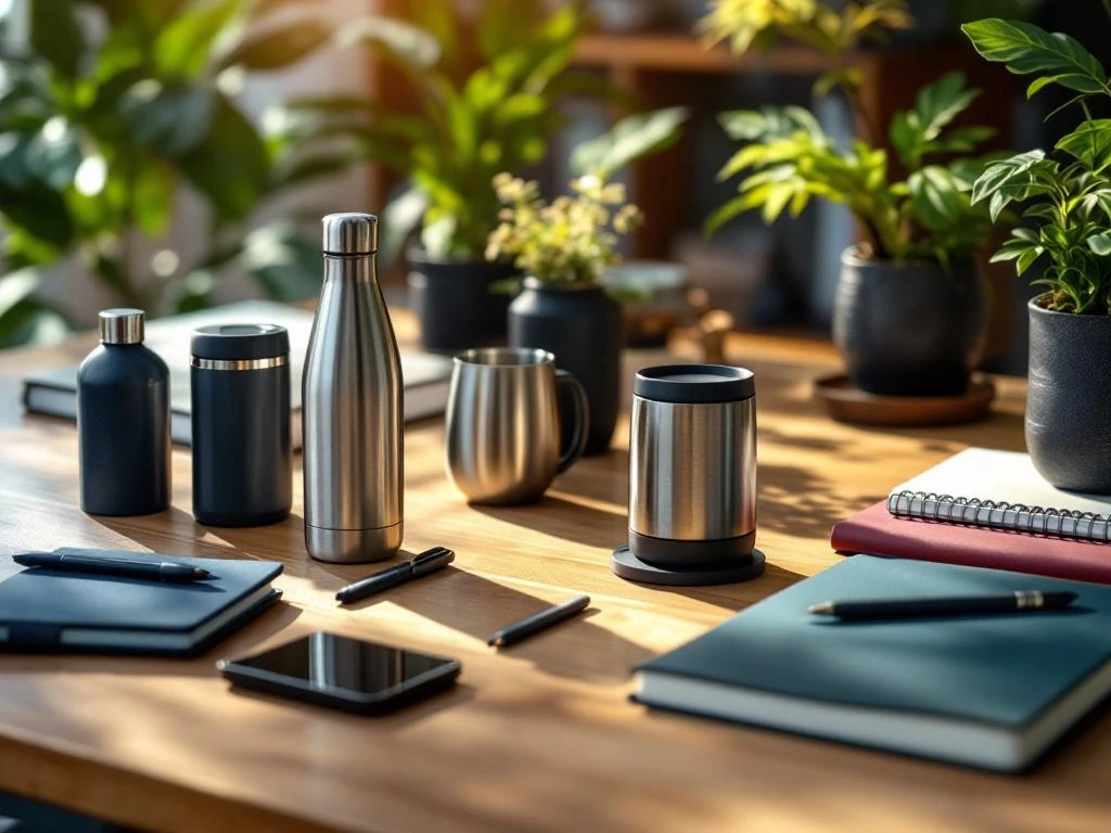 Duurzame bedrijfscadeaus op houten bureau: roestvrijstalen waterflessen, thermische mokken en eco-bureauaccessoires
